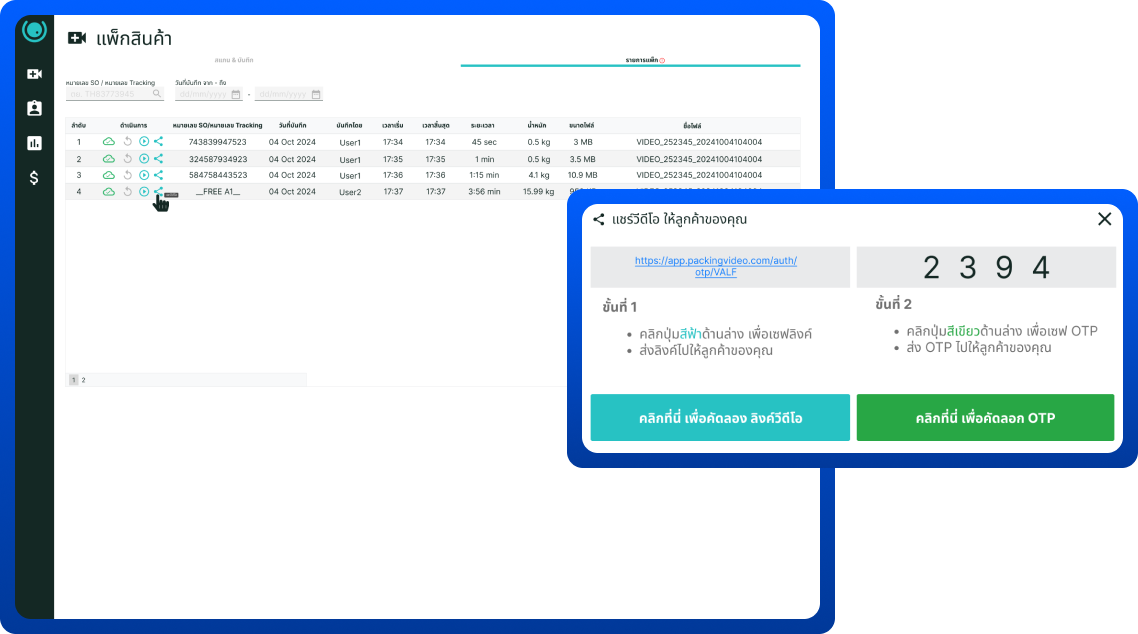 ปกป้องข้อมูลของคุณลูกค้าด้วยระบบ OTP พร้อมเวลาหมดอายุ ความปลอดภัยสูงสุด ทำให้มั่นใจได้ว่า จะไม่มีบุคคลอื่นเข้าถึงวีดีโอได้ ยกเว้นเจ้าของสินค้า และเจ้าหน้าที่ปฏิบัติงานเท่านั้น