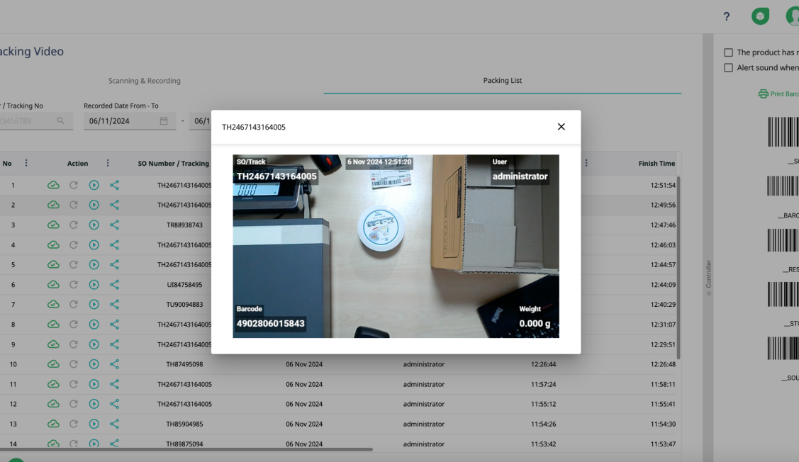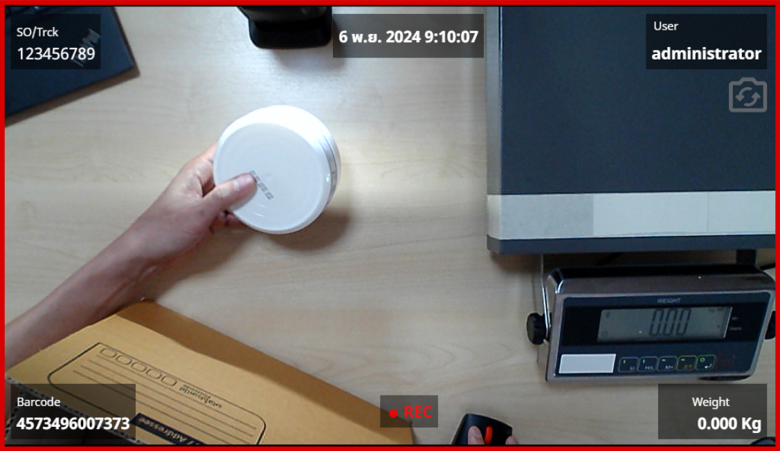 ข้อมูลจำเป็นทั้งหมดแสดงเป็น Overlay ในวีดีโอ ทั้งหมายเลข SO/Tracking, รหัสสินค้า, วัน, เวลา,น้ำหนัก, ชื่อผู้ดำเนินการ